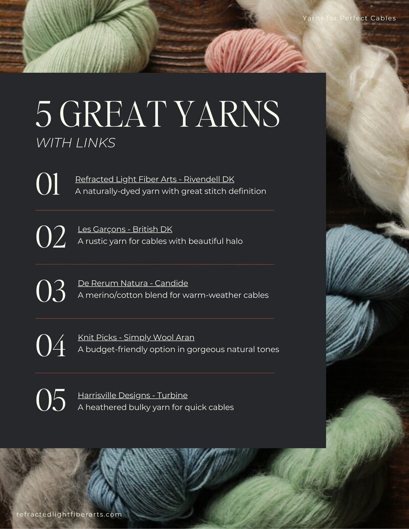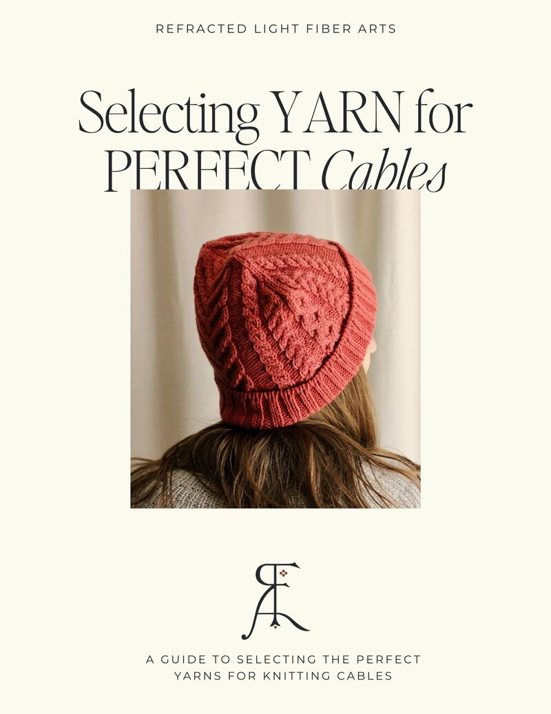 This 9-page guide includes information on how yarn construction, number of plies, and amount of twist affects cable texture, how color interacts with cables, and suggestions for 5 of my favorite yarns to knit cables with.