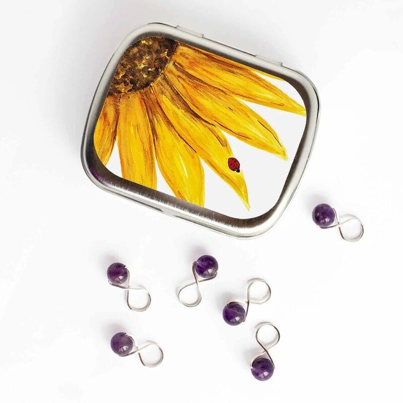 Small Tin size: approximately 2.5″ x 2″. Holds 6 stitch marker sets, row counters, and more. Shuts securely and won’t accidentally open in your bag. Keeps those tiny tools all in one place so you can always find them.