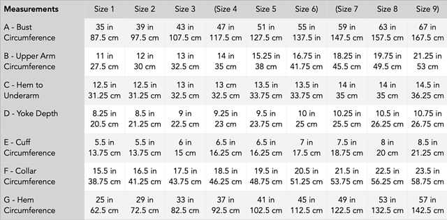 Bust - (35.5, 39.5, 43.25) (47.25, 51, 55) (59, 63.5, 67.5)in / (90, 100.5, 110) (120, 129.5, 139.5) (150, 161.5, 171.5)cm